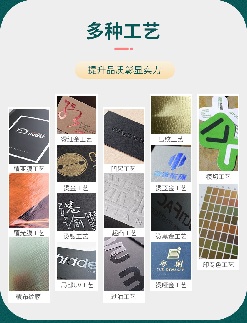 常用工藝:覆膜(啞膜、光膜)、壓紋、凹凸印、局部uv、燙銀、燙金、印專(zhuān)色(PANTONE色)、鏤空、鐳射、打孔、疊印、絲網(wǎng)印、透印、過(guò)光油、啞油等